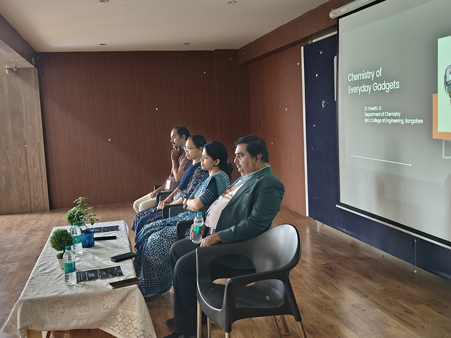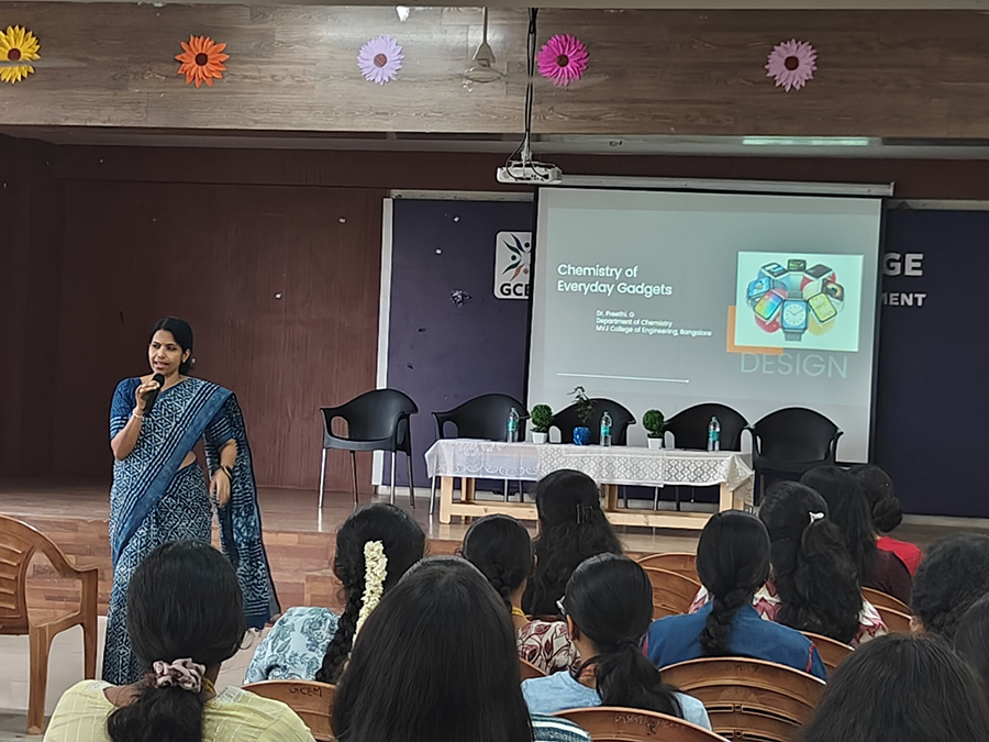 The Department of Chemistry organized an insightful guest lecture on the topic “Chemistry of Everyday Gadgets”, delivered by Dr. Preethi G, Associate Professor & HOD, Dept. of Chemistry, MVJ College of Engineering and Technology, Bengaluru on 24/05/2025 at 6th floor, Seminar Hall. The session attracted enthusiastic participation from students and faculty alike, eager to understand how chemistry plays a pivotal role in the functioning of the gadgets we use daily.