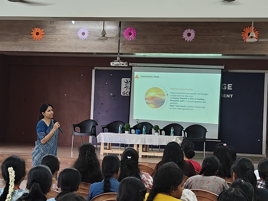Dr. Preethi G, an expert in nanoscience and applied sciences, began the lecture by highlighting the importance of chemistry in modern technology. She explained how fundamental chemical principles underpin the design, performance, and sustainability of devices ranging from smartphones and laptops to household appliances.