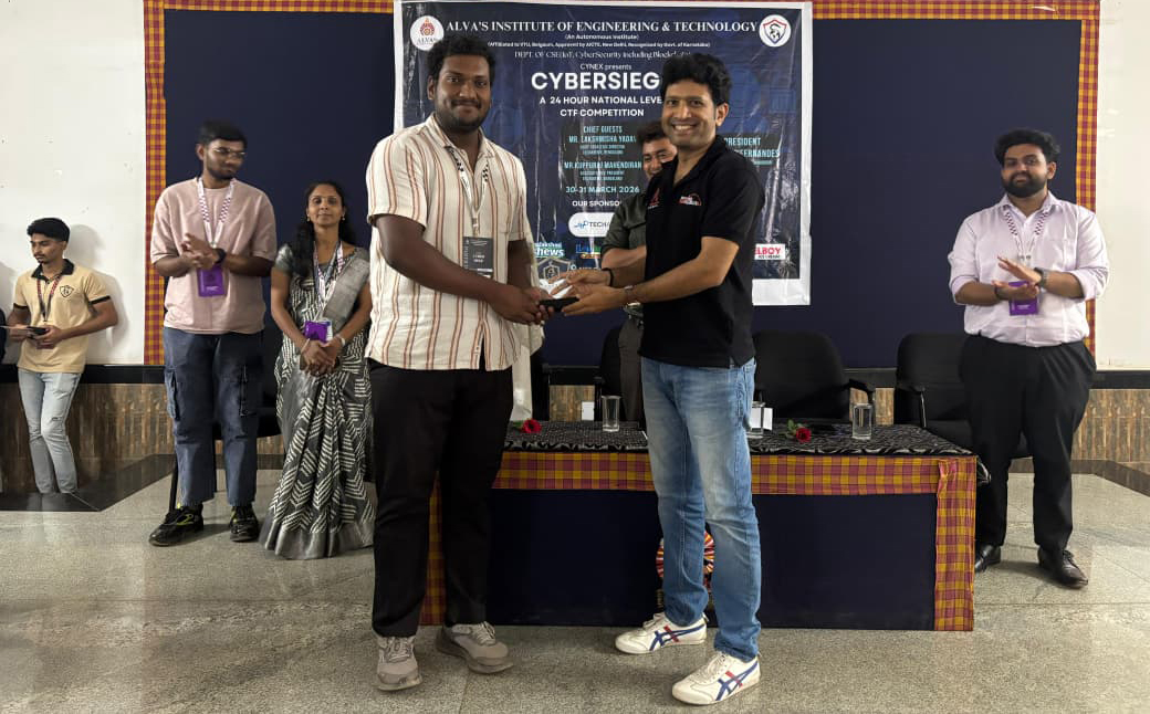 Congratulations to Our 6th semester student, M. Vivek has demonstrated outstanding performance in a 24-hour Capture the Flag (CTF) Cybersecurity competition conducted at Alva’s Institute of Engineering & Technology.