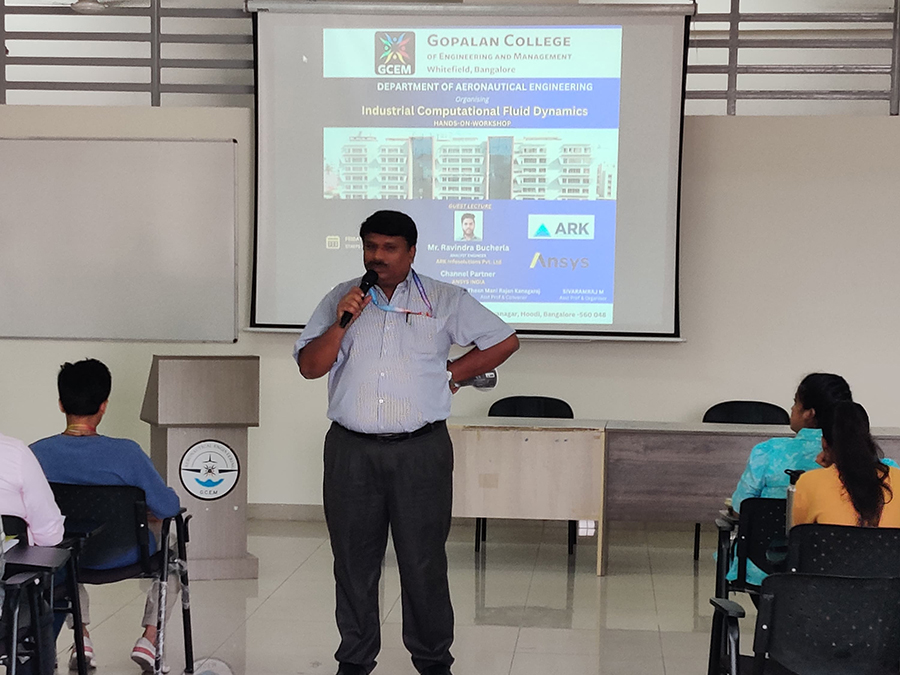 The Department of Aeronautical Engineering at Gopalan College of Engineering and Management (GCEM) organized a one-day workshop on Industrial Computational Fluid Dynamics-Hands-On-Workshop, on May 16, 2025. This event exposed students to Computational Fluid Dynamics (CFD), and enabled them explore cutting-edge research and technological advancements in the fields of aerospace, propulsion, materials science, and emerging technologies using CFD.
