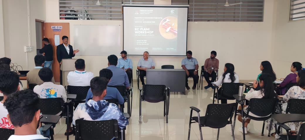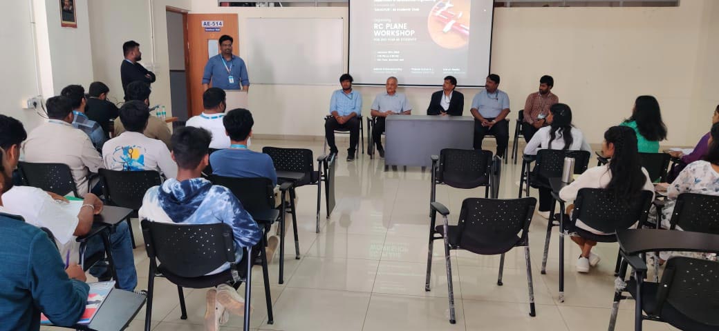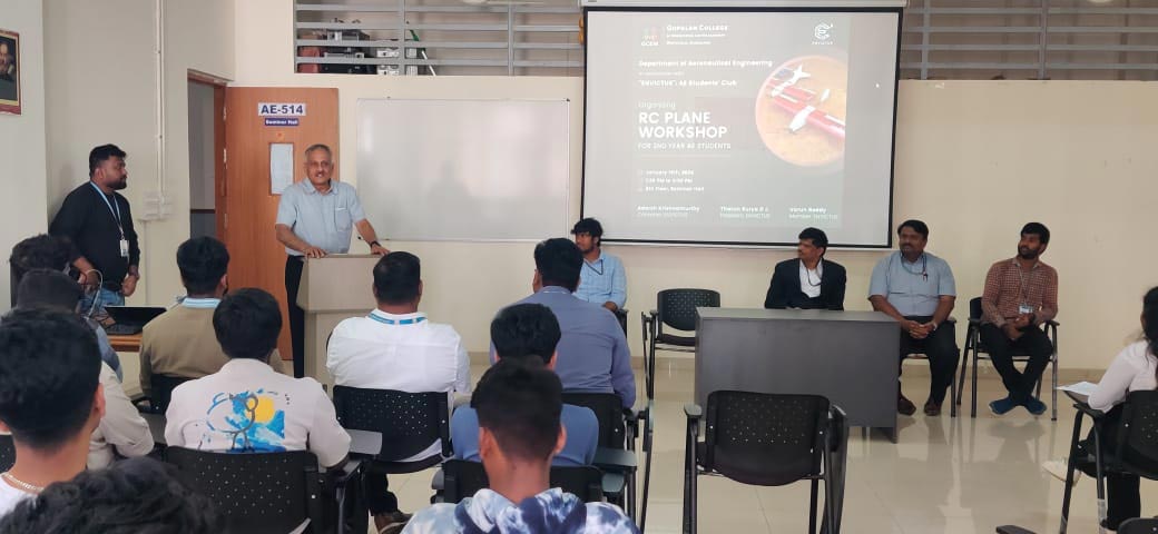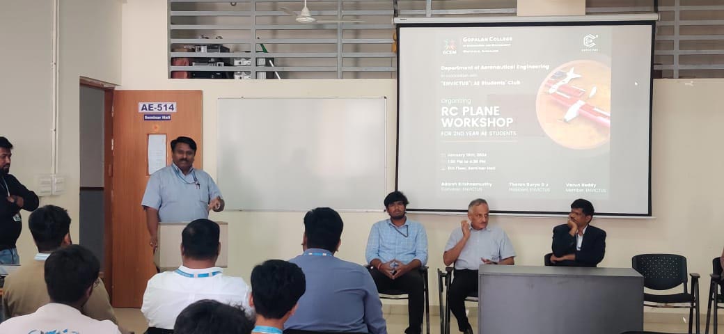 The one-day workshop on aero modelling of RC Aircraft was conducted on 16th Jan, 2024, at the Department of Aeronautical Engineering, Gopalan College of Engineering and Management, for 3rd-semester Aeronautical Students. The hands-on session was guided by Mr. Tharun Surya DJ, President of ENVICTUS, along with Mr. Varun Reddy and Mr. Gagan Devaraj, Members of ENVICTUS.