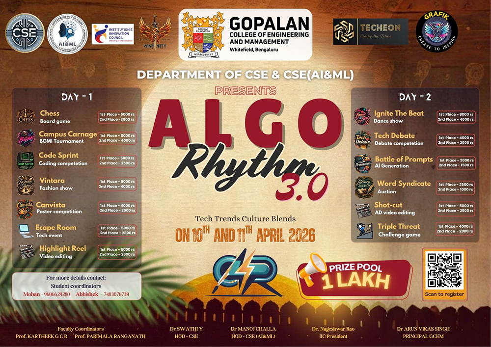 The Department of CSE and CSE (AI&ML) jointly organizing Algo-Rhythm 3.0 a power-packed fest blending technology, creativity, and pure fun on 10th & 11th April 2026.