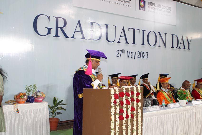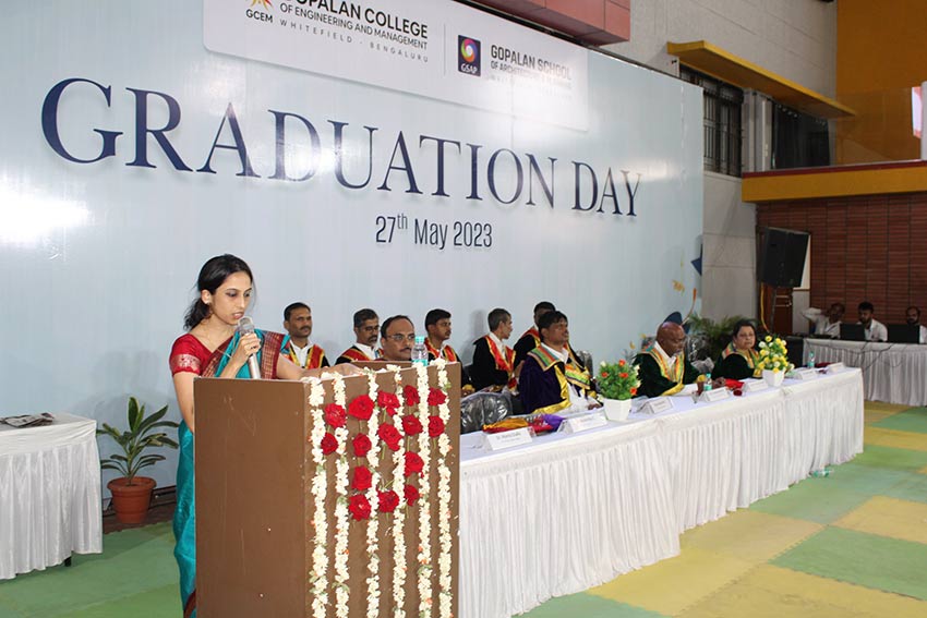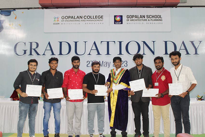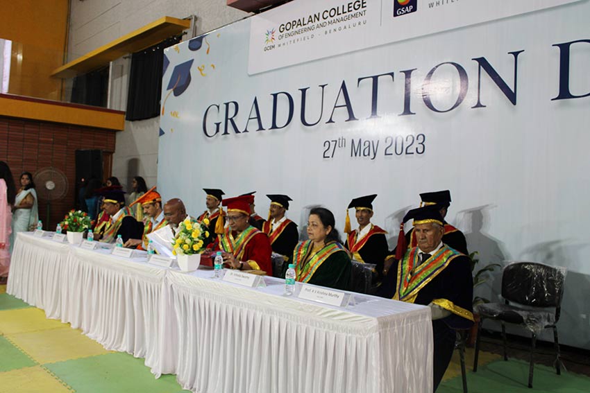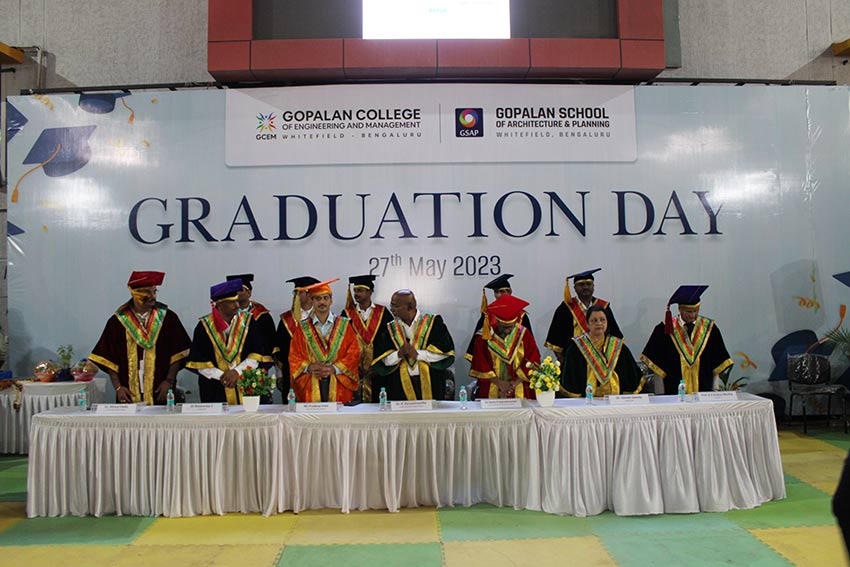 Graduation Day 2023 celebrated on 27-05-2023 @ GCEM Amphitheatre.Dr.R Karunamurthy presided the pragramme and Mr Pradeep Kote HR leader,Wiley India invited as a chief guest.Dr Rama Subramanyan,principal ,Dayanand Sagar school of Architecture as other Chief guest. Dr Vimalaswamy Principal GSAP and Dr. Basavaraju.C Principal GCEM are distributed the course completion certificate to all the graduates of all the Engineering branches and GSAP students.Along with certificates 3 toppers and best outgoing students has been honoured with medals and certificates. Thanks to our management Dr. C.Prabhakar General Secretary, Gopalan Foundation and Mrs. Sunitha Prabhakar, Director, Gopalan Organics for all cooperation and support in conducting events successfully.