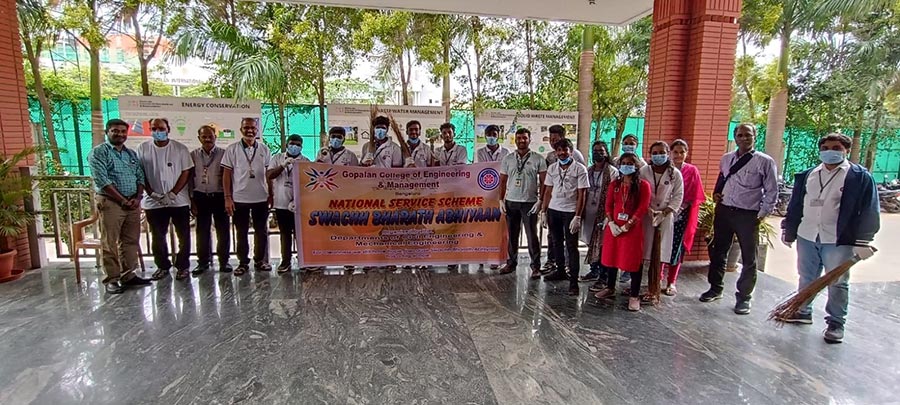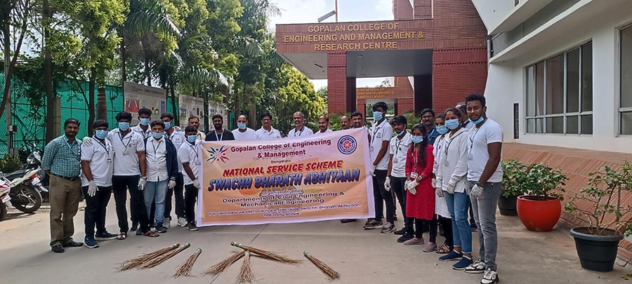 Swachh Bharat Abhiyan (SBA) is a campaign in India that aims to clean up the streets, roads, and infrastructure of India's cities, smaller towns, and rural areas. We must maintain cleanliness in our homes, colleges, and public places to ensure good health. A clean and tidy environment not only looks good but also has a positive impact on our mental well-being. It creates a welcoming atmosphere and makes us feel more relaxed. Gopalan College of Engineering and Management (GCEM) students from the Mechanical Engineering and Civil Engineering departments, part of the National Service Scheme (NSS), conducted Swachh Bharat on 17-07-2023 in the surroundings of the college campus (Hoodi Village). The event was organized and coordinated under the guidance of Dr.Basavaraj.C, Principal of GCEM, Dr. Natarajan, HOD (ME), Shreyas HC, Assistant Professor of the Civil Department, D. Sreenivasa Reddy, NSS Coordinator, GCEM, and all the staff of the Civil and Mechanical Engineering Departments. The event started at 2:30 PM at Gopalan Engineering College and Management (GCEM), Bangalore, with a speech by the Principal of GCEM. He spoke a few words about the importance of cleanliness in daily life. Our Principal initiated the program by cleaning the entrance of the college. The NSS volunteers from the Civil and Mechanical Engineering departments, along with the staff, actively participated in creating awareness among the public, informing them about the importance of cleanliness. The students also took the initiative to clean the surroundings of the vicinity. The volunteers wore gloves and collected all the litter in big bags for disposal. Nearly 20 NSS Volunteers, twenty staff members, and ten non-teaching staff from the Civil and Mechanical Engineering departments participated in the program. After working for two to three hours, we all assembled in the college premises. The volunteers were instructed to clean their hands with soap at the end, and refreshments were distributed to them. In the end, we all took an oath to keep our homes, locality, and city clean. It was a unique experience for all of us. We were proud to be part of this great drive that could have transformed the face of our country forever. We thank the Management, Staff, and Students for their valuable support in making the NSS activity a grand success.