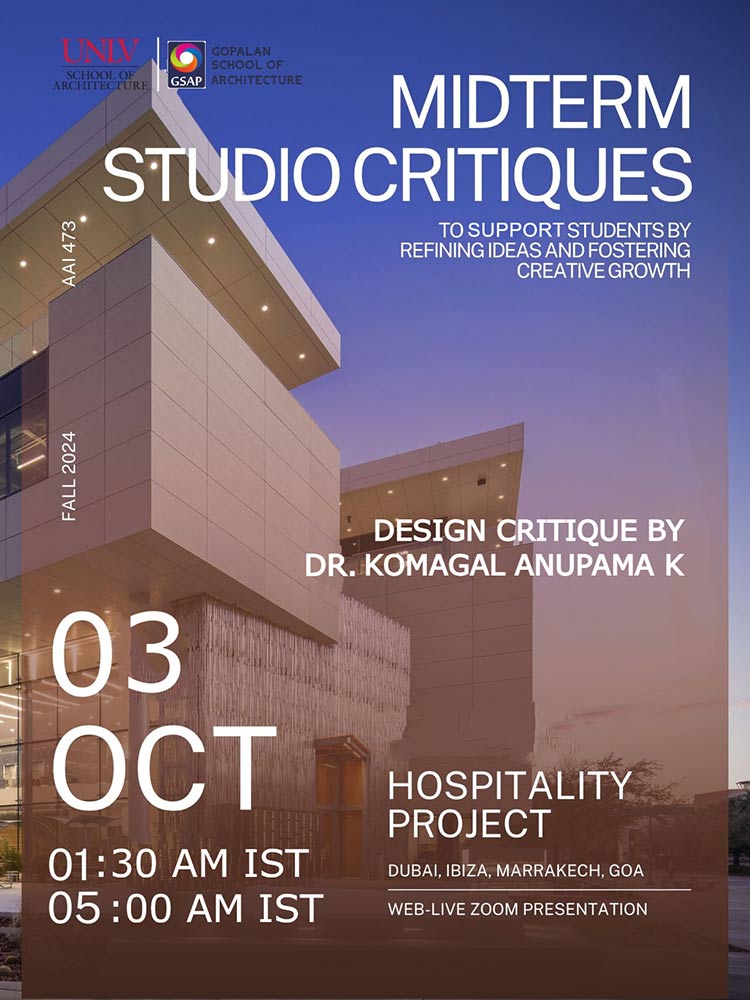 Proud moment for the Gopalan School of Architecture and Planning as Dr. Komagal Anupama K, Professor at GSAP, was invited as an international jury member for the Midterm Design Jury Critique for Fall 2024. The design critique focused on a hospitality project that beautifully integrates the cultural significance and sustainability of India, Morocco, Spain, and Dubai. (Oct 03, 2024).