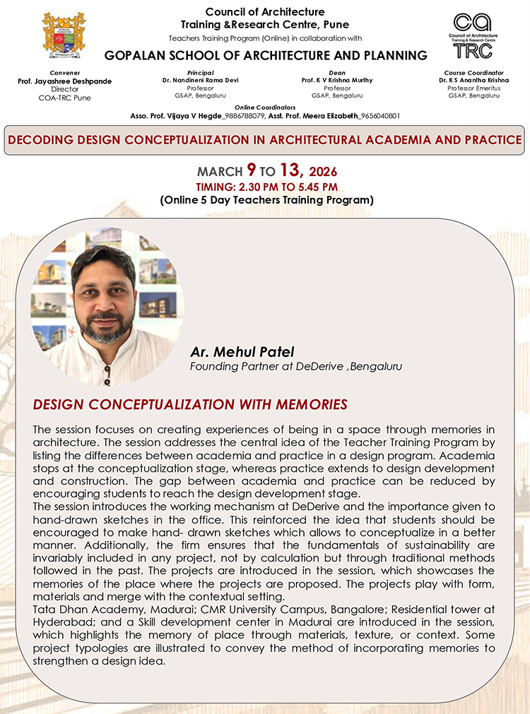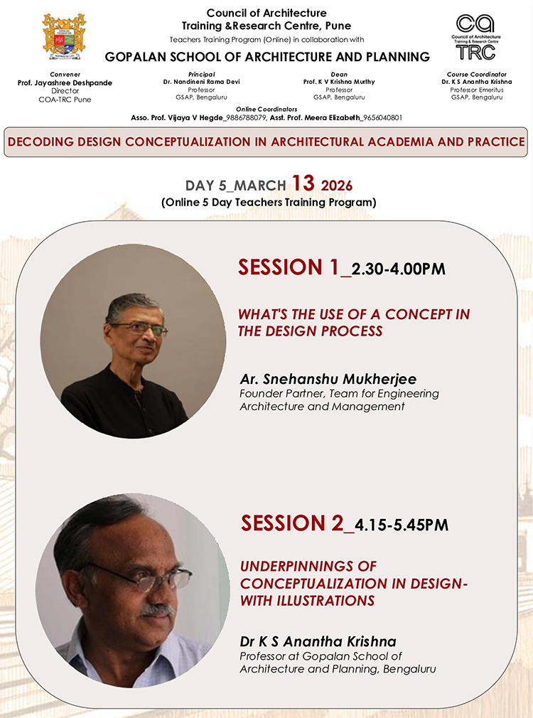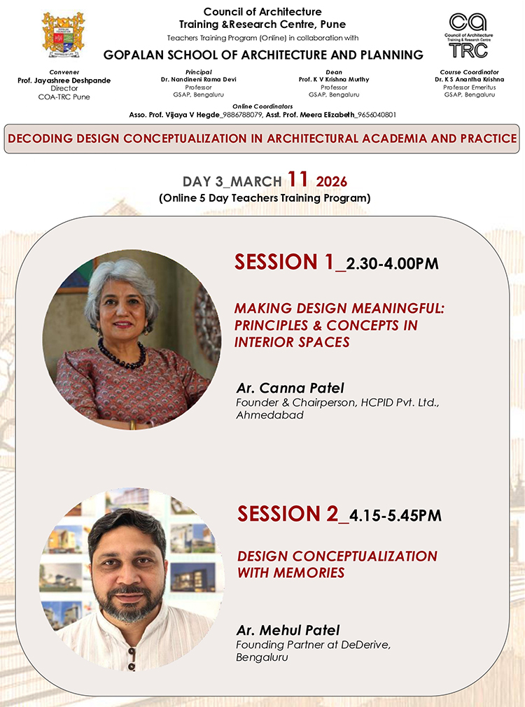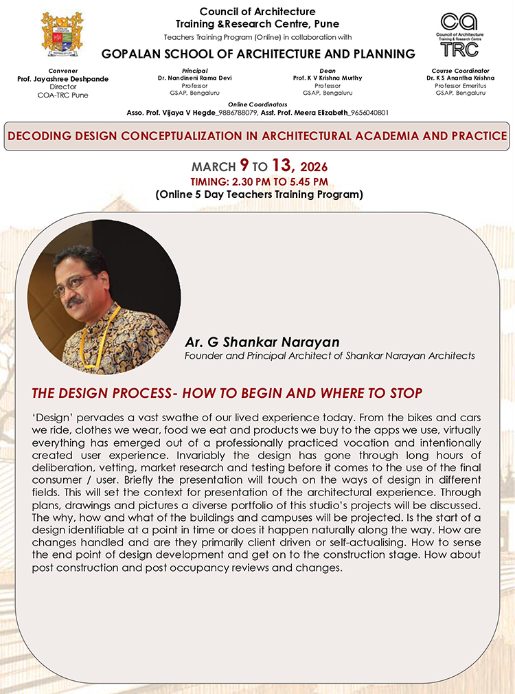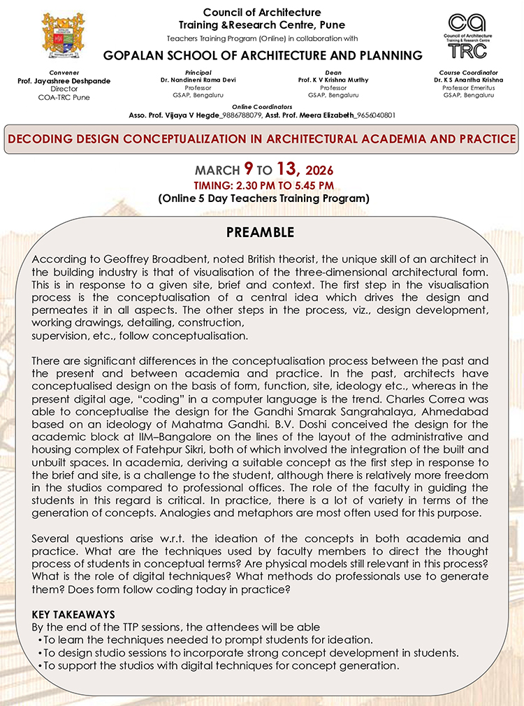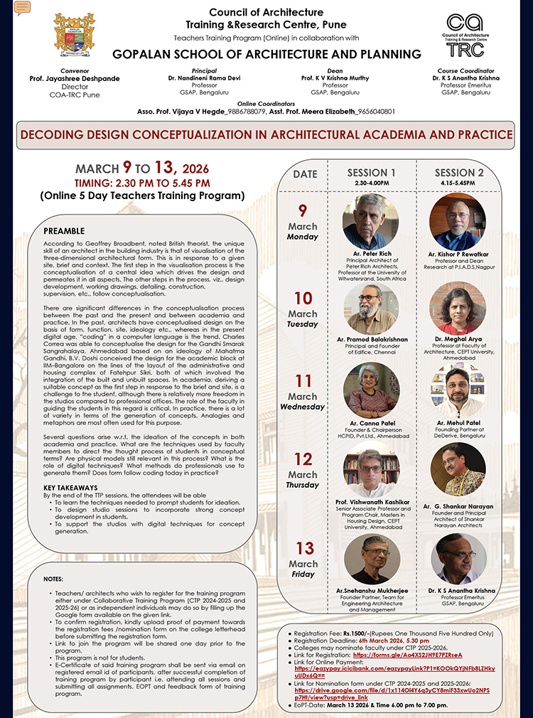 The Council of Architecture – Training & Research Centre, Pune, in collaboration with Gopalan School of Architecture and Planning, organized a 5-Day Online Teachers Training Program titled: