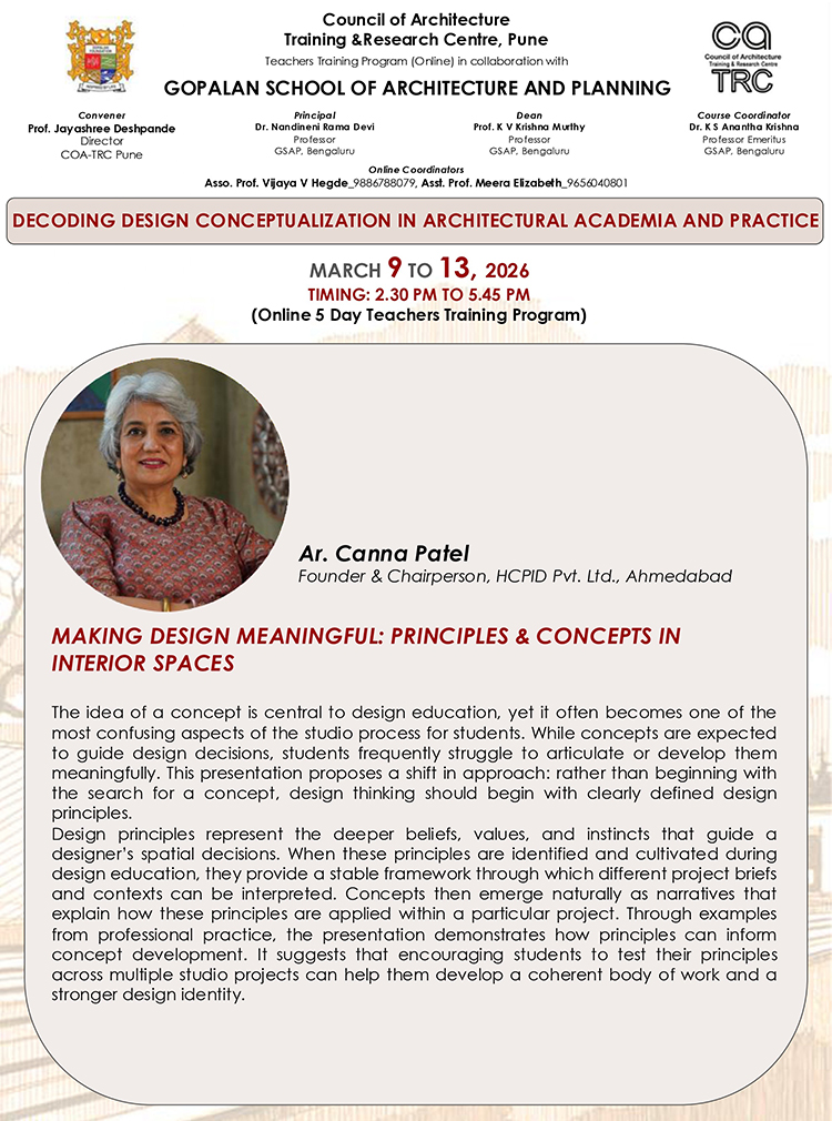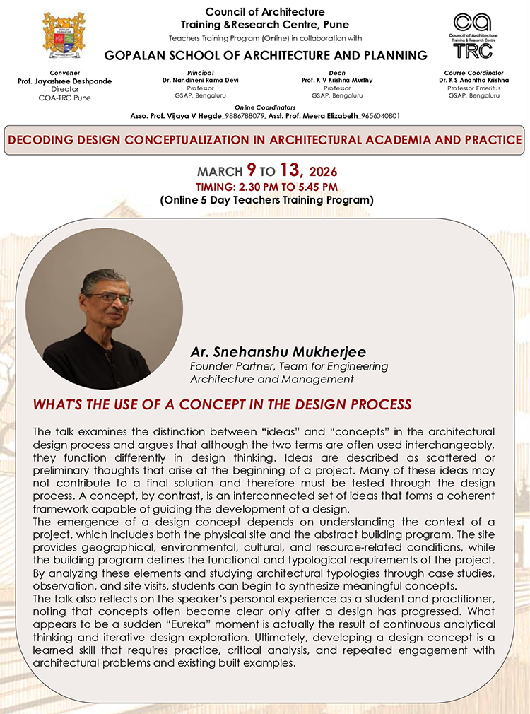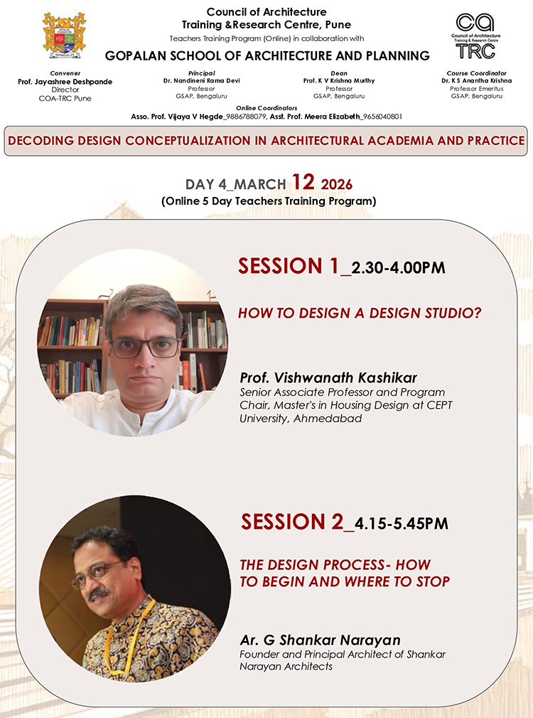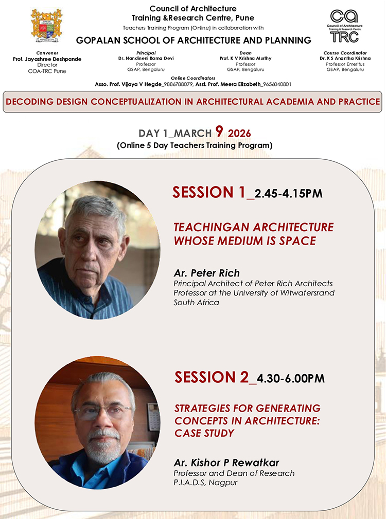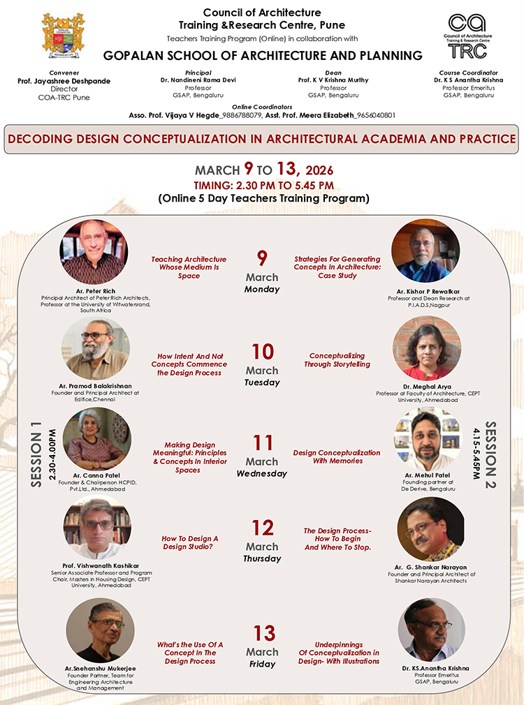 The Council of Architecture – Training & Research Centre, Pune, in collaboration with Gopalan School of Architecture and Planning, organized a 5-Day Online Teachers Training Program titled: