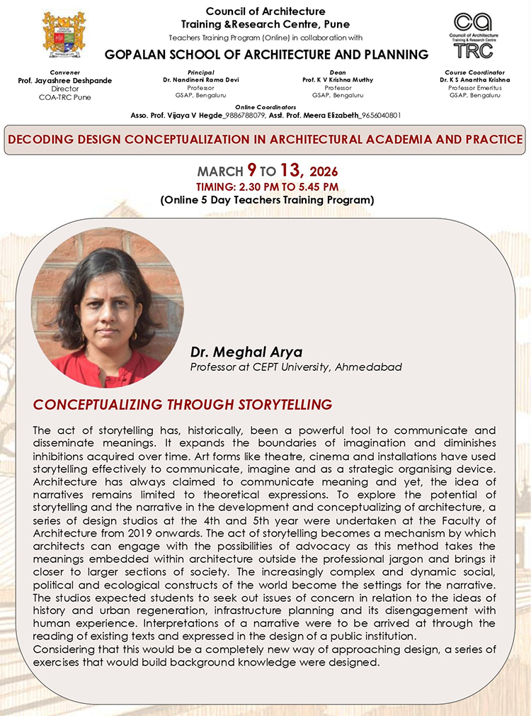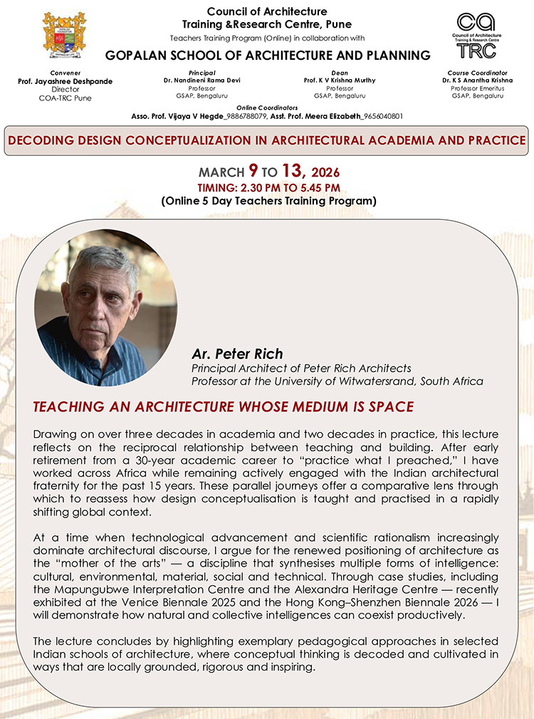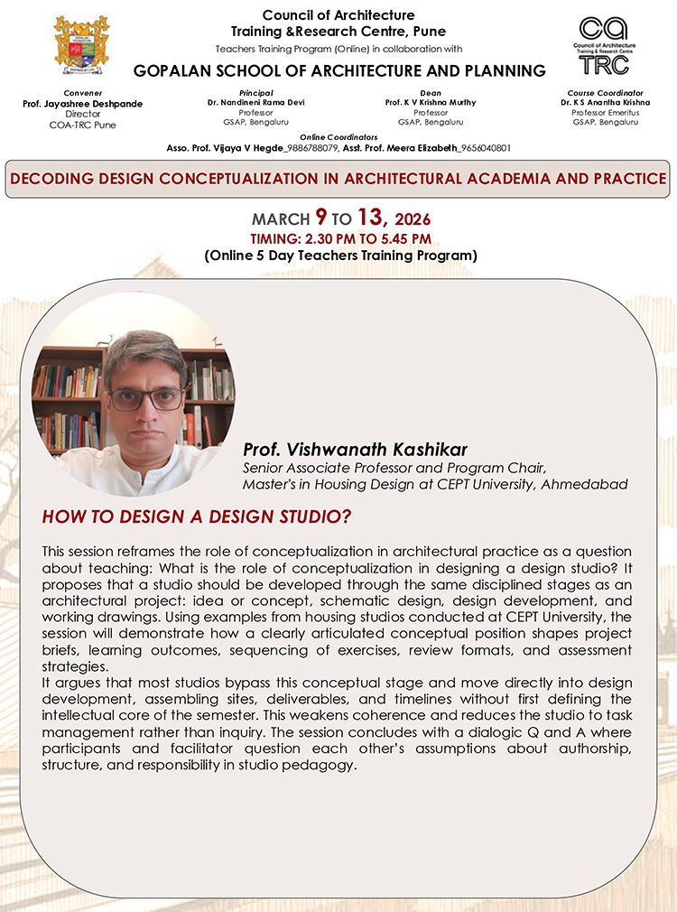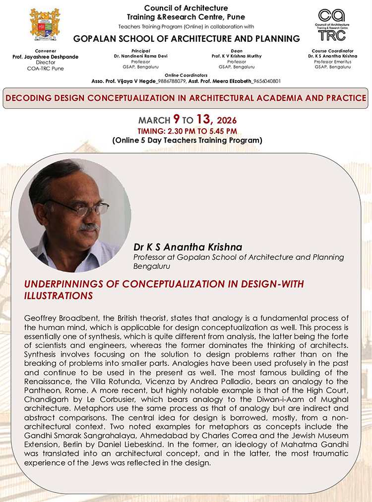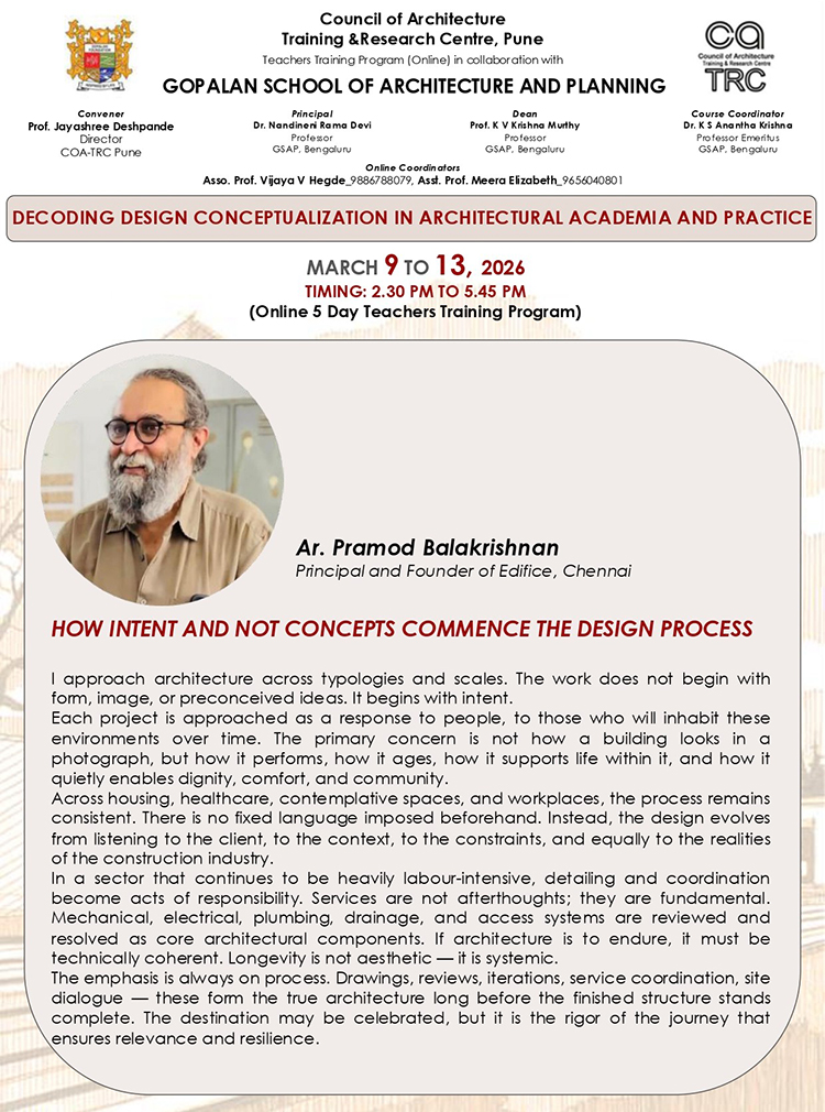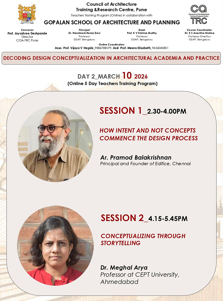 The Council of Architecture – Training & Research Centre, Pune, in collaboration with Gopalan School of Architecture and Planning, organized a 5-Day Online Teachers Training Program titled: