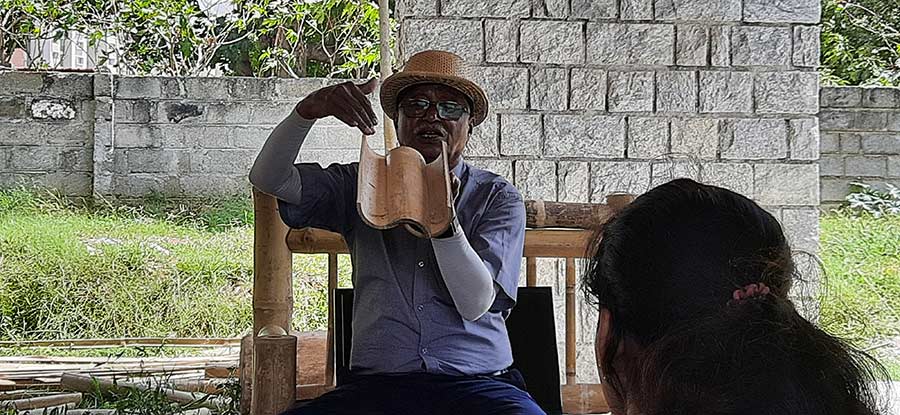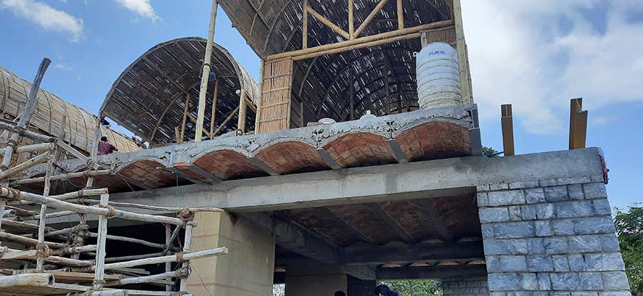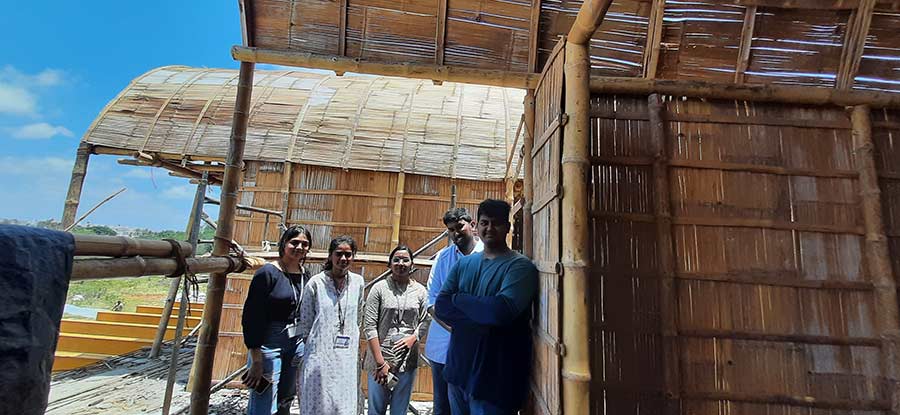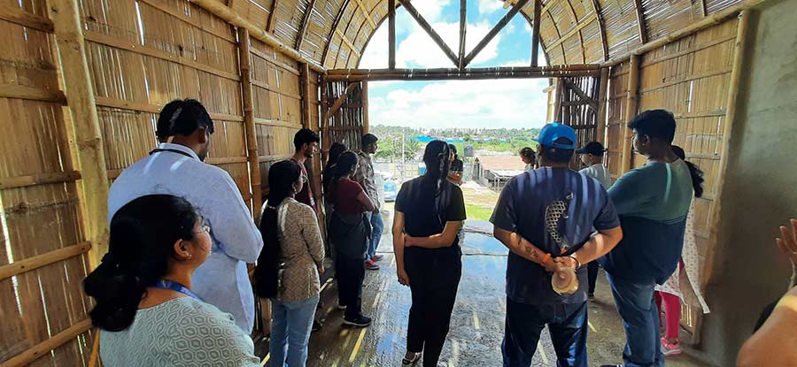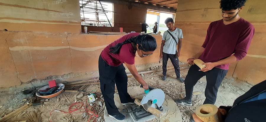 The students were able to understand the use of different types of bamboos for various applications in the construction of a building. They also had a hands-on-experience by cutting the bamboo shoots and learning the typical joinery details. Additionally students were explained about the traditional stabilized mud block wall and jack arch roof used in the construction of walls and roof structure.