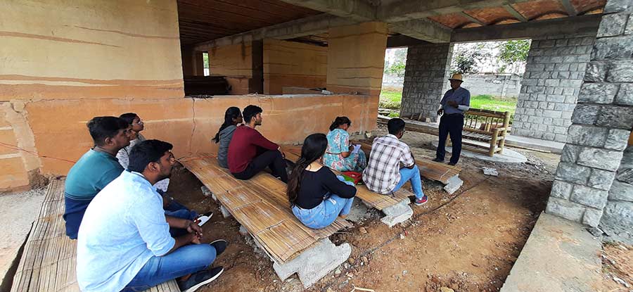 The workshop conducted by him at the construction site of a café design near Hoskote, Bengaluru was attended by the 5th Sem students of GSAP along with the facultie,s Ar. Poorani Balamurugan and Ar. Vijaya Hegde to incorporate a hand-on-experience for the students.