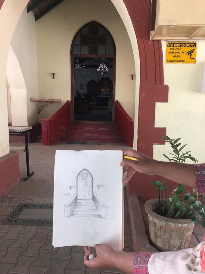 As part of observational study in BDVA, the students were asked to sketch outdoors, the interesting architectural elements of the historical church built in 1886.